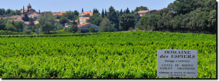 Arbejdet i vinmarkerne ledes på begge domæner af Philippe Cartoux, som på sin egne vingård laver en hvid og en rød Côtes-du-Rhône, en udmærket Sablet på 80% Grenache og 20% Syrah samt sine to Gigondas: Gigondas "Les Grames". Her er masser af det hele, alkohol, frugt, saft og kraft. En rigtig flot vin med en meget lang eftersmag. Laves på 70% Grenache og 30% Syrah. 30% af vinen lagres på mellemstore tønder, kaldet demi-muids i 12 måneder. Philippe Cartoux laver også en luksuscuvée kaldet "Cuvée des Blaches", som ligeledes laves på 70% Grenache og 30% Syrah, men som lagres i 10 mdr på barriques, en vin som findes på kortet hos flere af Frankrigs 3 stjernede restauranter. Vinene fra det 9,5 ha store Domaine des Espiers dyrkes økologisk og vinene er normalt udsolgt kort efter de sættes til salg. Forhandles af Bottle hero.