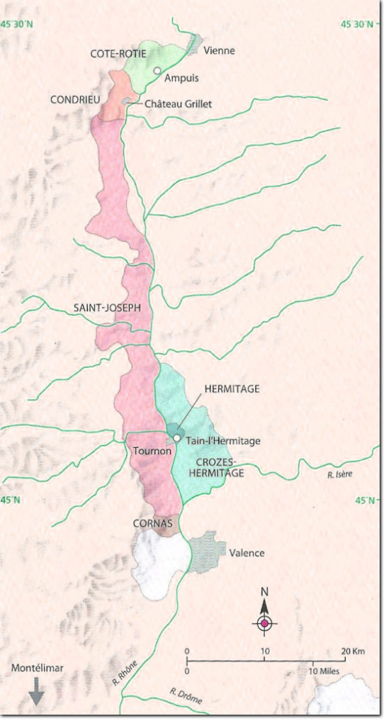 Det nordlige Rhône begynder lige syd for Vienne og strækker sig i en smal stribe langs med floden til Valence, ca. 75 km længere mod syd. Her på de stejle skråninger, der visse steder hælder 55-60 grader, dyrkes verdens bedste Syrah vine og her yder de hvide Viognier druer sit ypperste. Det nodlige Rhône dækker et areal på ca. 2400 ha., dvs. den samlede produktion er mindre end hvad der produceres alene i Châteauneuf-du-Pape! Det nordlige Rhône dækker følgende appelationer: