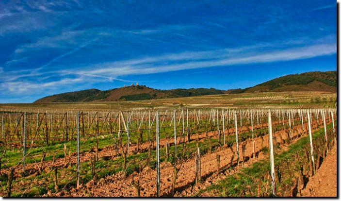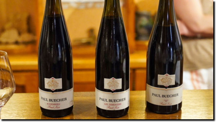 "Det er den bedste Bourgogne jeg har smagt i lang tid"`- Ja, altså lige bortset fra at denne vin Pinot Noir "Rosenberg - Les Terrasses" fra Domaine Paul Buecher et Fils i Wettolsheim ikke er en Bourgogne, men en rødvin fra Alsace. Familien Buecher, der oprindelig er fra Schweiz, kom til Alsace ved trediveårgskrigens afslutning og har siden da dyrket vin i Wettolsheim tæt ved Colmar. Vingården, der i dag er på 30 ha., dyrkes økologisk og har marker i flere Grand Cru'er, Brand, Hengst og Sommerberg foruden flere Lieu-Dit'er som Rosenberg, Heimbourg, Herrenweg og Gottestal. Der laves selvfølgelg vine i høj kvalitet fra alle de "Syv søstre" i tre niveauer, Expression, den traitionelle linie, Terroir, vine der repræsenterer de forskellige navngivne marker, og Préstige, som udgøres af Vendanges Tardives og Sélections de Grains Nobles, de søde dessertvine. Domænet har længe været interesseret i at fremstille rødvine af høj kvalitet, og har derfor fundet frem til parceller i markerne Rosenberg og Hengst, der egner sig specielt til Pinot Noir. Fra Rosenberg laves to vine: "Pinot Noir Rosenberg", en dejlig vin med en aroma af frugt og krydderier, rund med bløde tanniner og lang eftersmag. Denne vine lagres ikke på fad. Fra Rosenberg kommer også "Les Terrasses" fra specielt udvalgte parceller anlagt på terrasser øverst oppe på marken. Det er en dejlig vin med duft af kirsebær, brombær og eau de vie de Kirsch, med bløde, modne tanniner, velintegreret træ og en meget lang eftersmag. En vin, der af The Good Life Magazine regnes for en af de 12 bedste rødvine i Alsace. Øverst oppe på kransekagen finder man en micro-cuvée Pinot Noir "H", hvor "H" står for Grand Cru marken "Hengst", som nu er godkendt som Grand Cru også for røde vine. Der laves meget få flasker årligt, men denne gang lykkedes det mig endelig at få lov til at smage den, og også få lov til at købe. Vinene fra Domaine Paul Buecher kan købes hos HP-vine i Herning