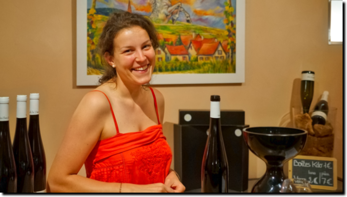 Amélie og Cécile har hentet mange priser og mange rosende ord for deres vine, bl.a. for deres Cremant lavet på Pinot Noir, og for de fleste af deres hvide vine. Men formålet for vores besøg var deres røde vine, hvoraf de laver 3. Den billigste "Périgée" kommer fra marker i Walbach, den næstsidste vinby inden man kører ud af vinområderne på vej til ostebyen Munster. Det er den mest traditionelle rødvin, den letteste, men stadig kraftigere end de fleste Alsace rødvine. Den lagres ikke på eg. Dernæst "Lune Noire", der kommer fra de øverste stejle marker i Walbach tæt på skovgrænsen, den er meget aromatisk med duft af kirsebær. En del lagres på eg og resten på ståltanke. Og så, på toppen af kransekagen, "Céleste" fra en ekseptionel parcel i Voegtlinshoffen (Hatschbourg?). Denne vin laves i meget små mængder, lagres på ny eg. Der laves kun hvad der svarer til 800 flasker om året. Den er tør, elegant, intens med bløde tanniner, og er selvfølgelig også dyr! Tre meget spændende vine.